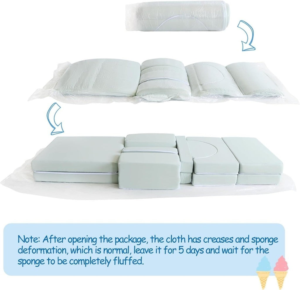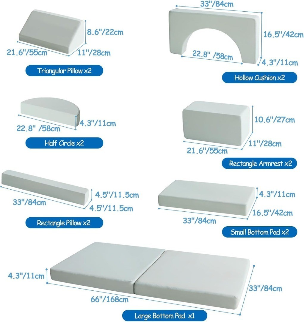 - 14 PCS DESIGN: The modular kids sofa compose of 14 piece of modules; Two supporting triangular pillows, two rectangular pillows, two rectangle armrest, two semicircular pillows, a hollow rectangular cushion (composed of two modules), two small cushions and two large cushions; The child couch is the perfect addition to any playroom, offering a fold out couch bed that doubles as a comfortable couch for kids.