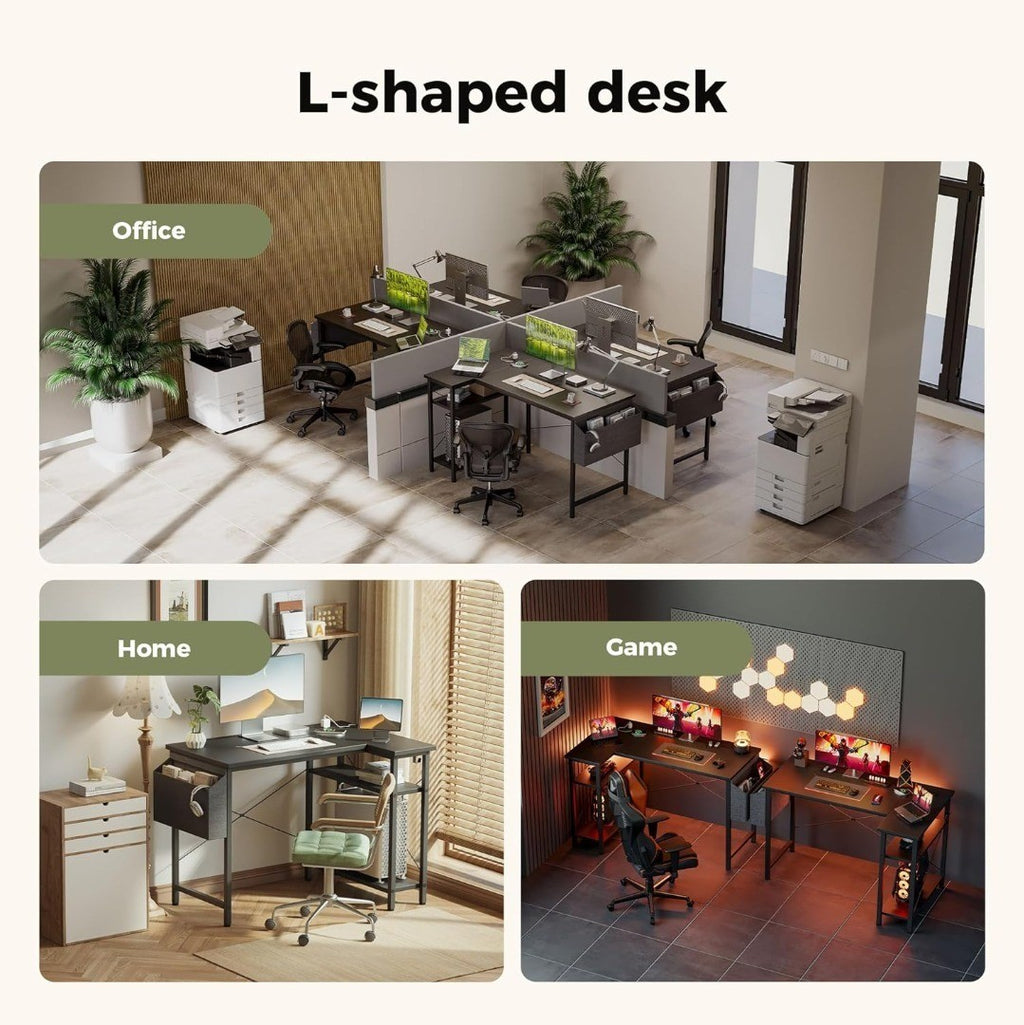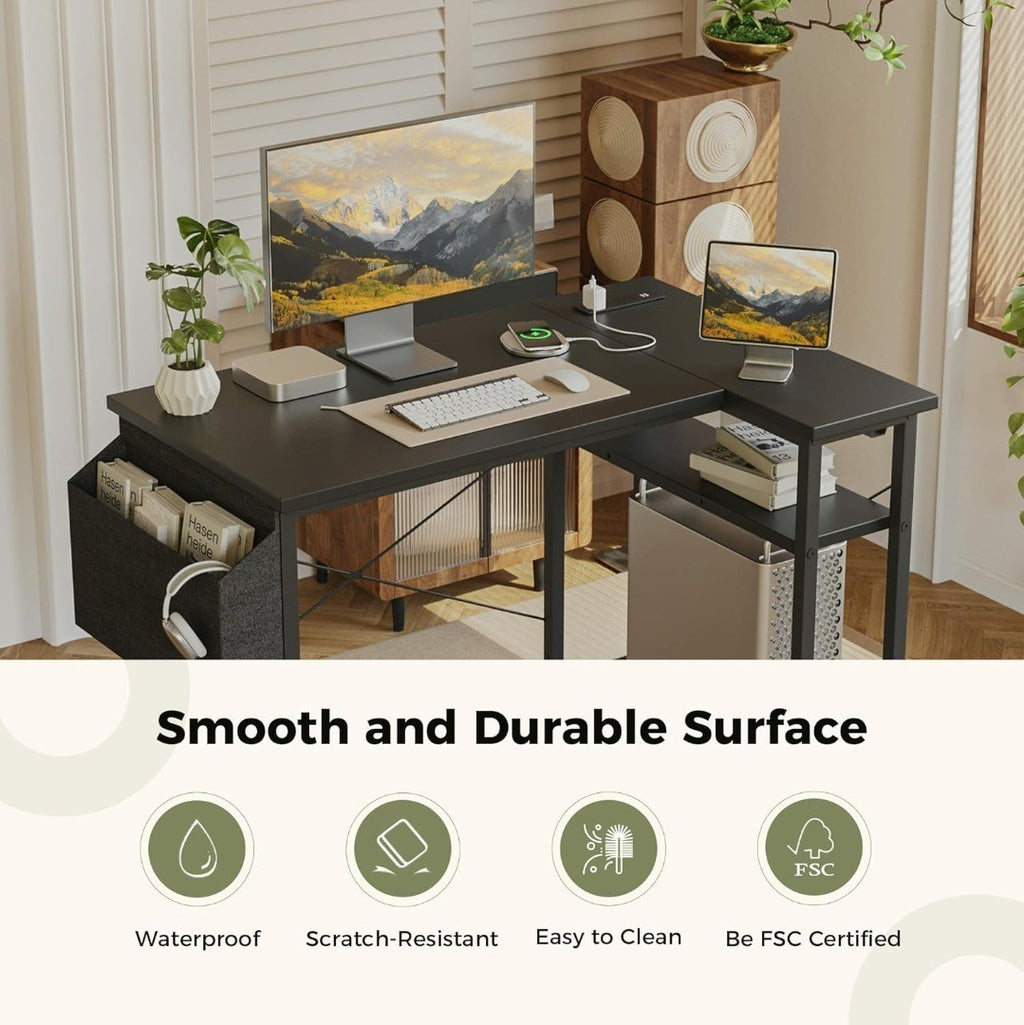 L-Shaped Computer Desk with Shelves & Power Outlets 100cm Black