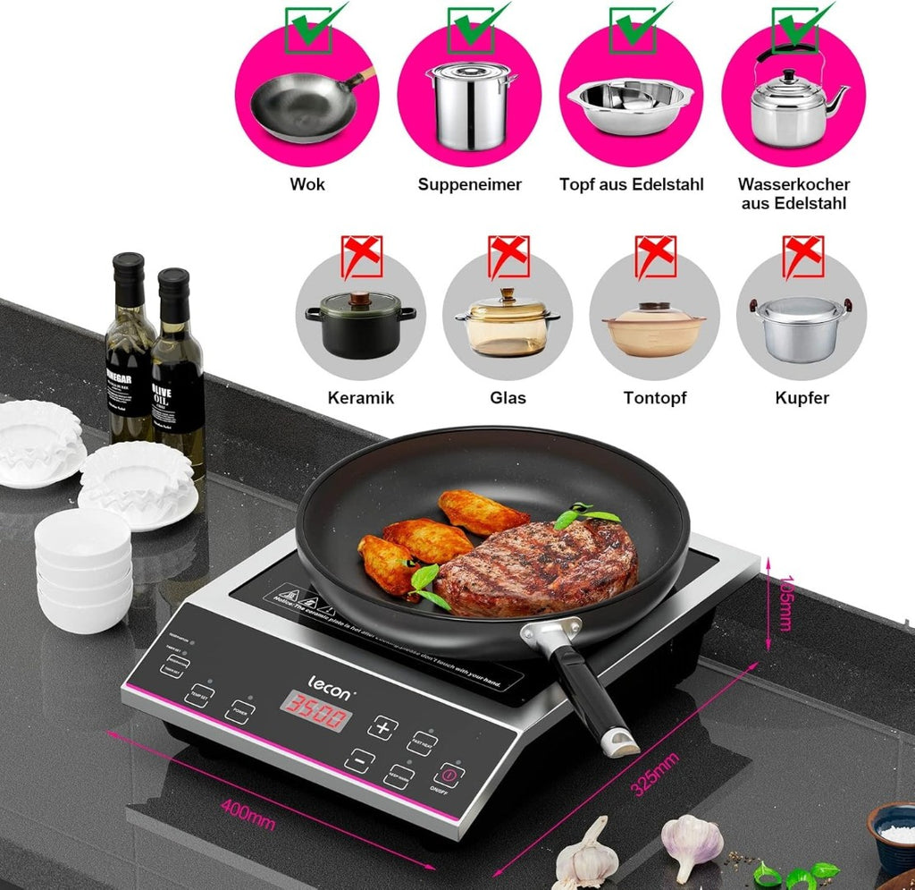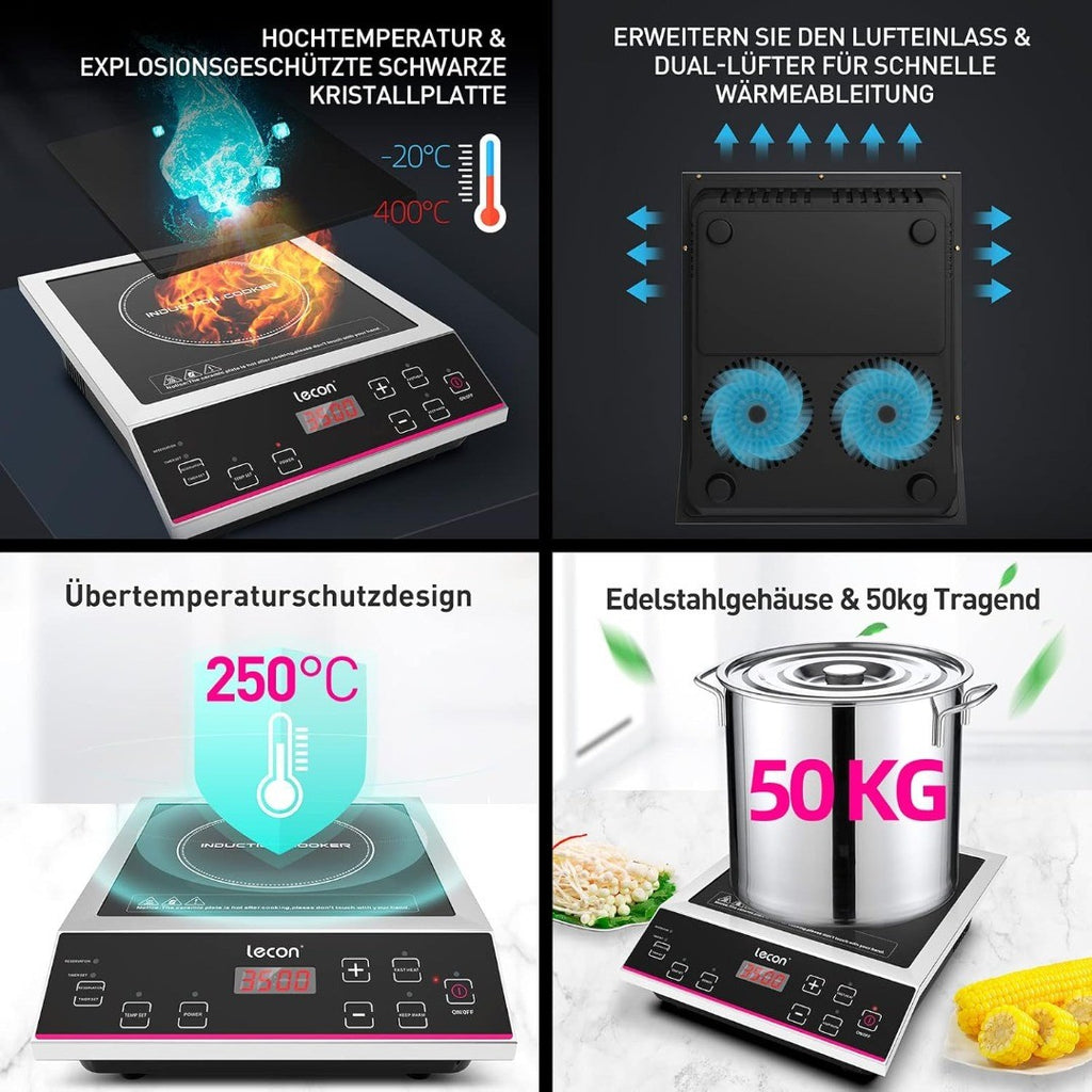 Lecon 3500W Induction Hob – On/Off Timer, Temperature Control, Stainless Steel, 50kg Load Capacity