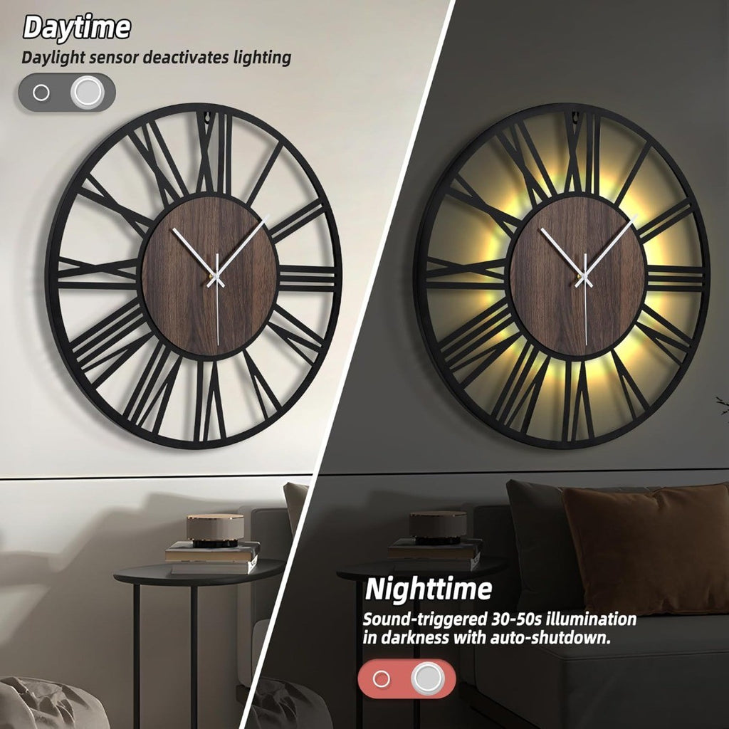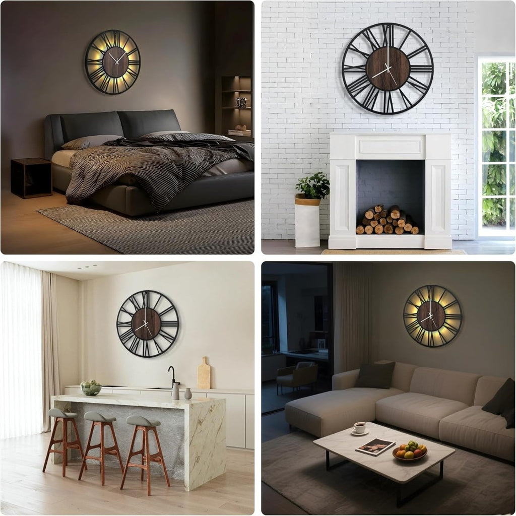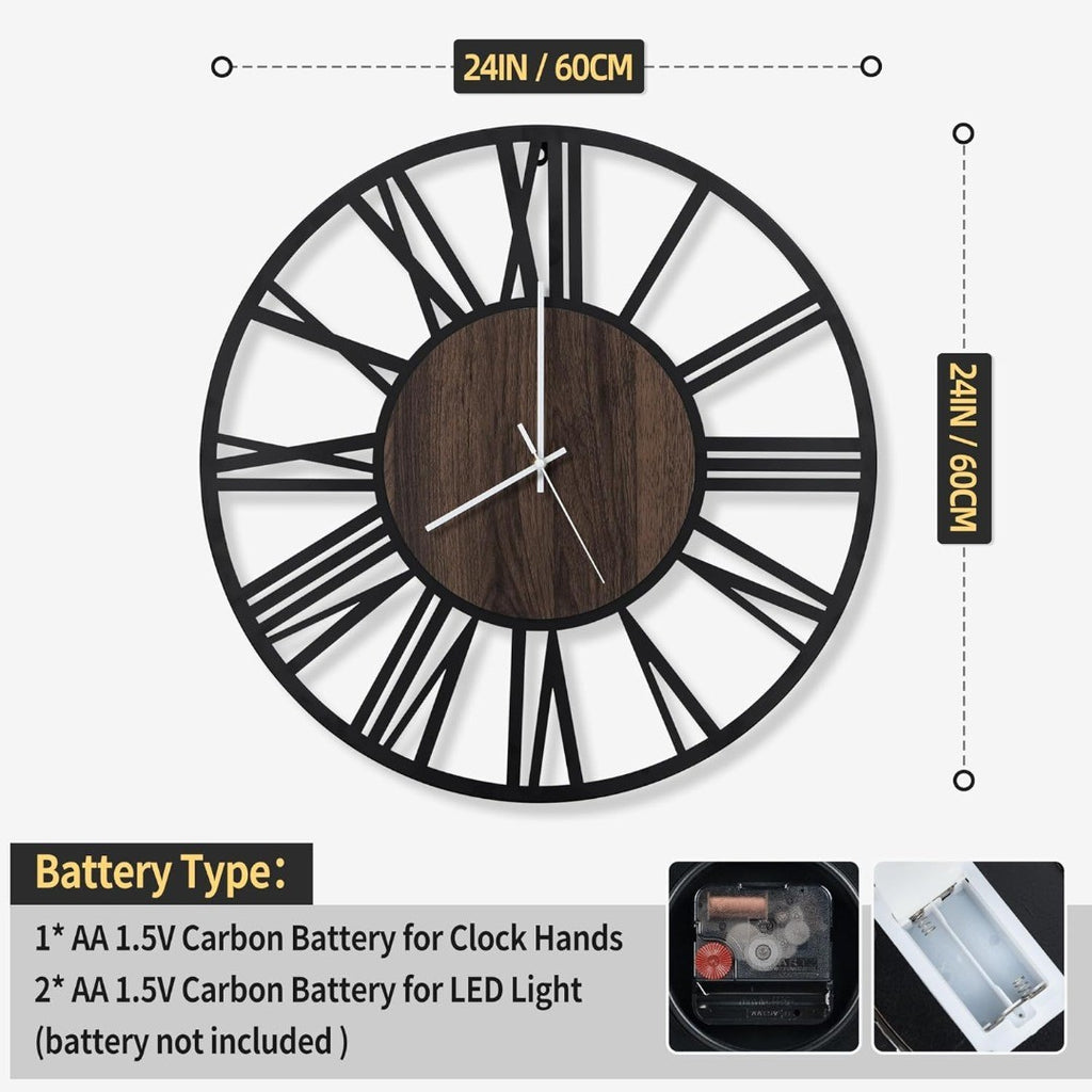 Maxstar 60CM Large Wall Clock for Living Room, Battery Operated,Silent,Non Ticking,Wood Style,Modern Led Wall Clock for Bedroom,Garage,Office,Dining Room, Kitchen Decor(Roman numerals,Black-24)