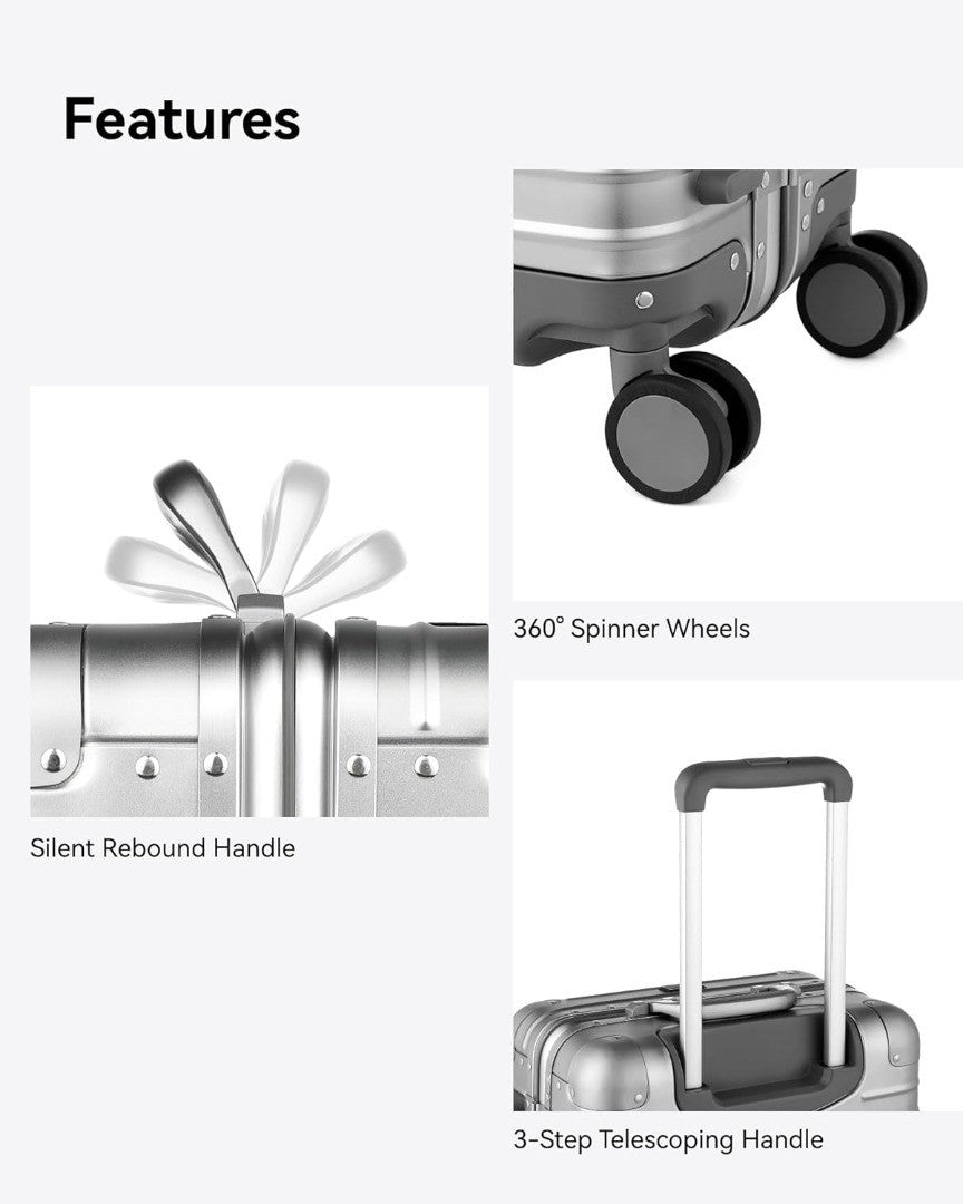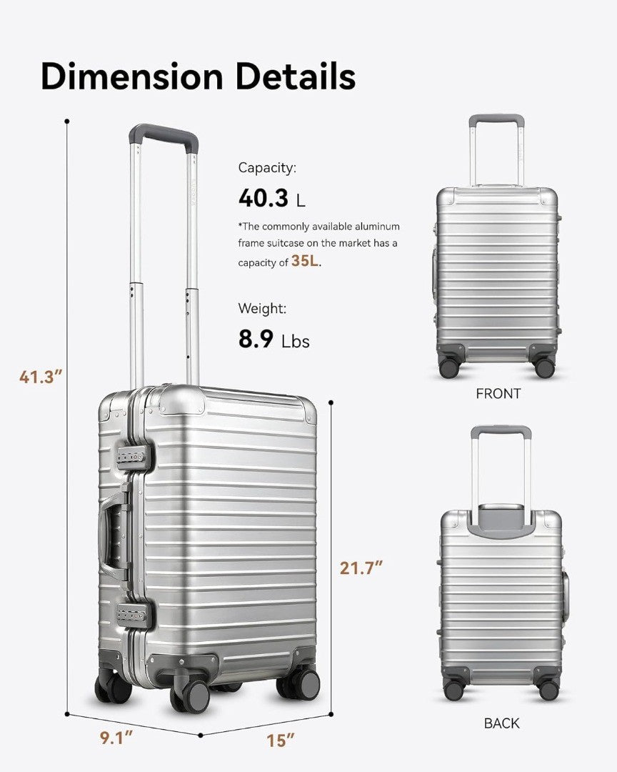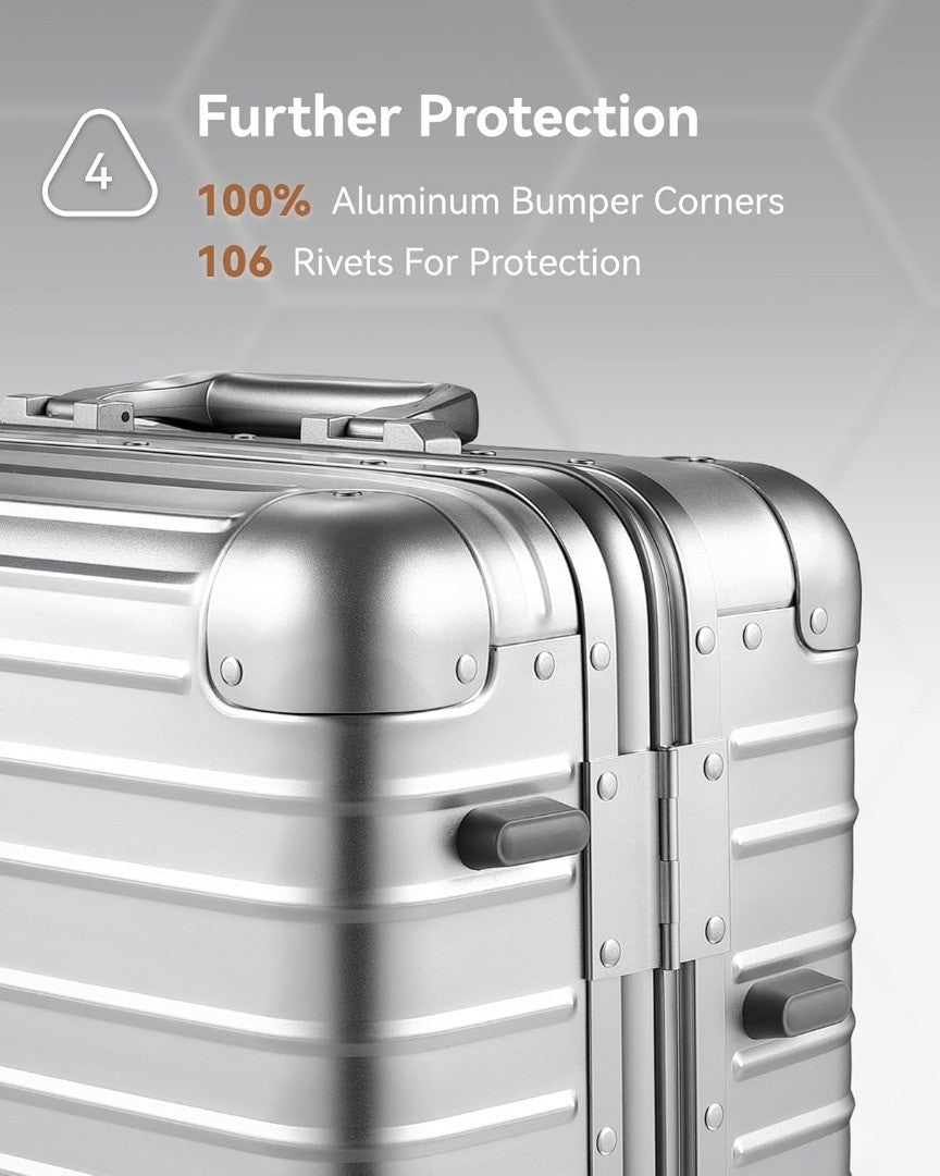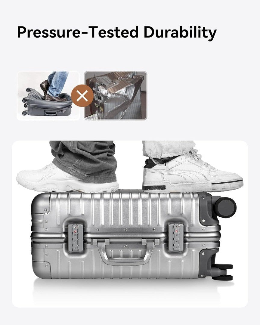- First Class Travelling Experience: Our hard suitcase is made of premium aluminium-magnesium alloy that redefines durability. It has 5 reinforced corners to withstand the rigours of travel and protect your valuables in style.