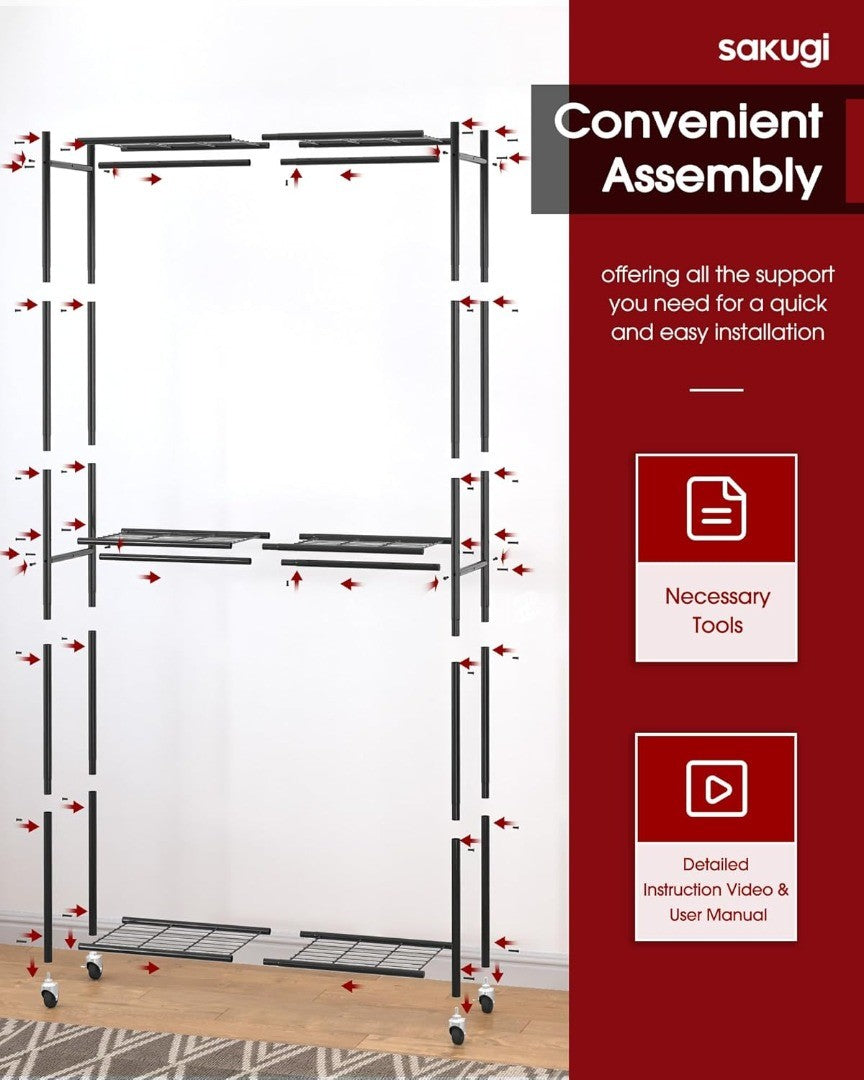 PREMIUM CONSTRUCTION: Sakugi heavy-duty clothes rail for bedroom features a premium construction made from sturdy metal tubes and mesh shelves, ensuring durability and strength. Secure screw connections further enhance its stability, allowing this clothing rack to support up to 180kg without bending.