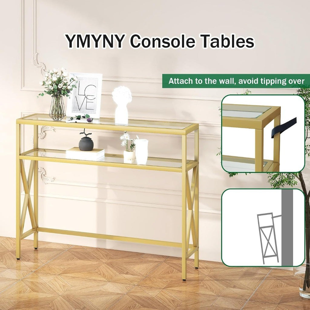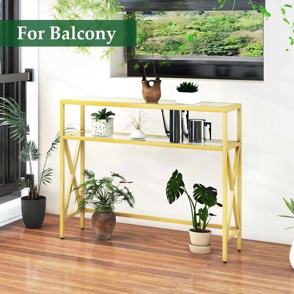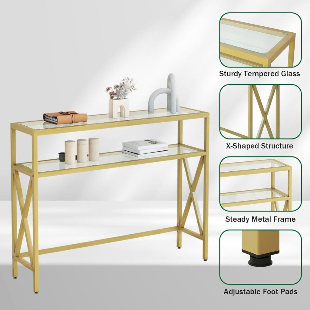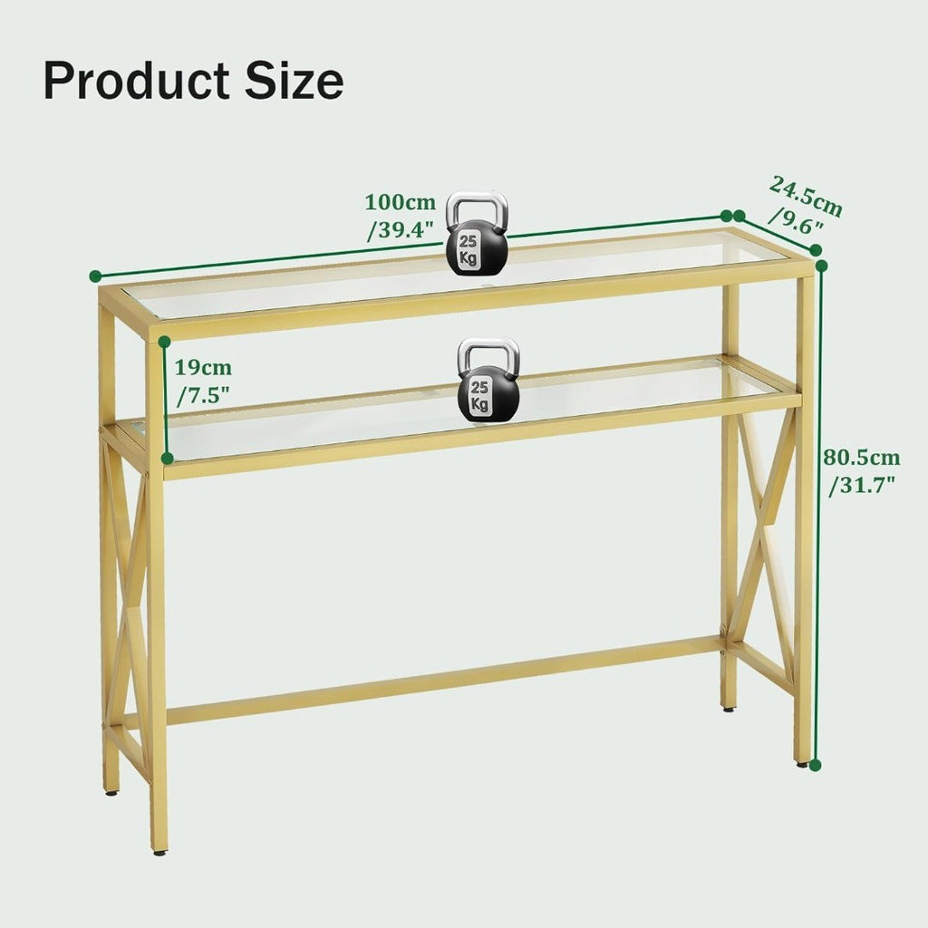 Console Table, Tempered Glass Sofa Table, Industrial Entryway Table for Hallway, Narrow Sofa Table with Shelves, Compact Display Table for Small Spaces, Living Room, 100×24.5×80.5CM Gold HGD007G.