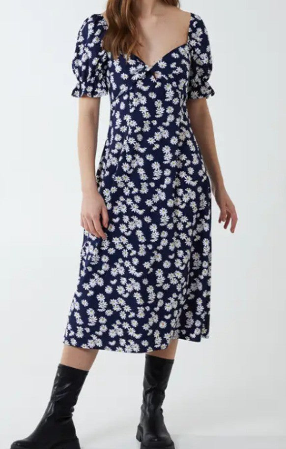 QED London Womens Twist Front Puff Sleeved Midi Dress in Daisy Print Navy UK8 NWT