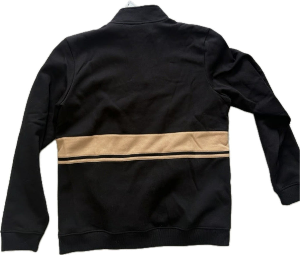 This is a THORTON 1/4 ZIP men’s quarter-zip sweatshirt features a classic black design (Color: Black/Tan) with a 1/4 zip opening and a stand-up collar, making it suitable for both casual everyday wear and athletic activities.