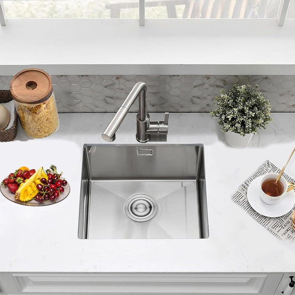 UNDERMOUNT INSTALLTION: This sink is as easy to mount as a small kitchen sink (Support top mount). The stainless sink comes ready to install with a basket plug. Simply take the plumbing kit & get the work done fast & easy.