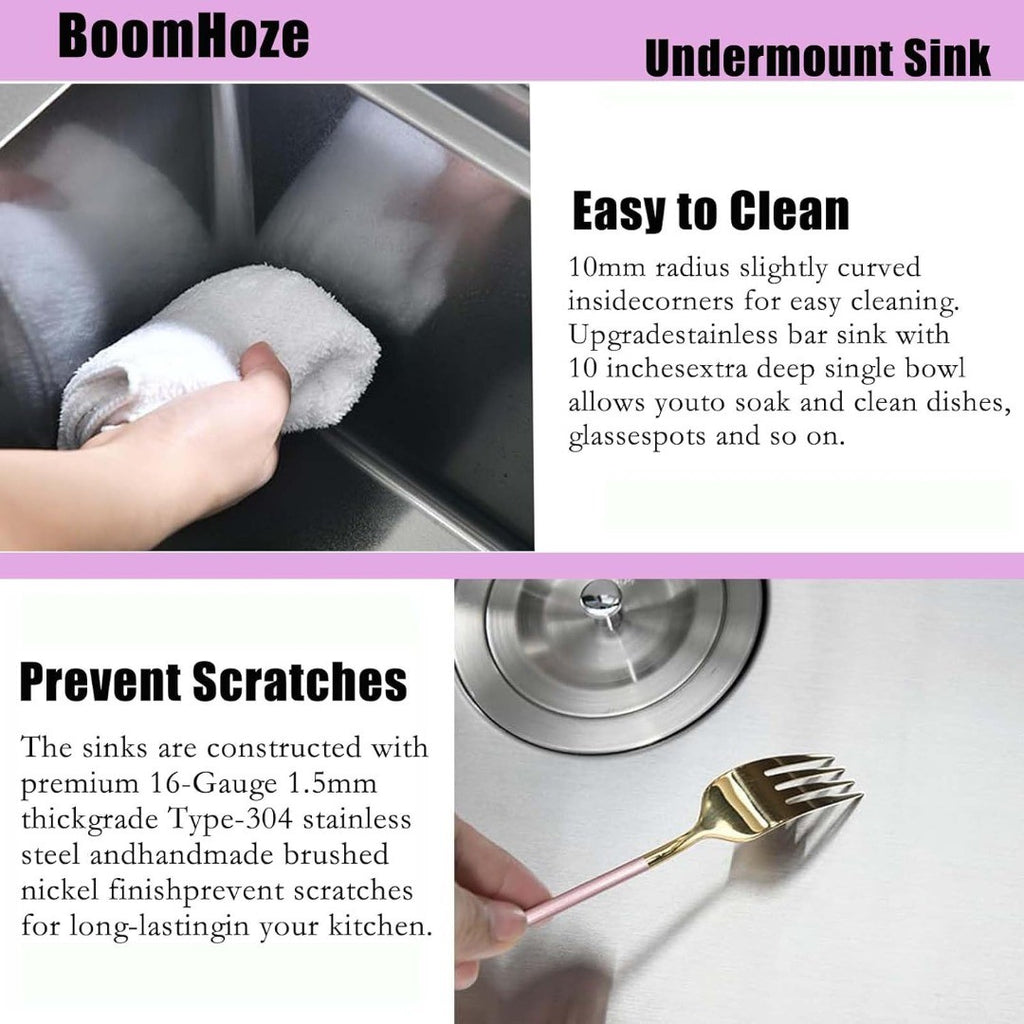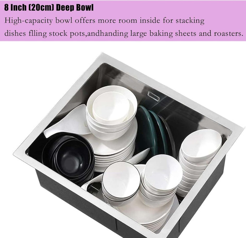 EASY T0 CLEAN: 10mm radius slightly curved in side corners for easy cleaning. Upgrade stainless bar sink with 8 inches(20cm)deep single bowl allows you to soak and clean dishes, glasses, pots and so on.