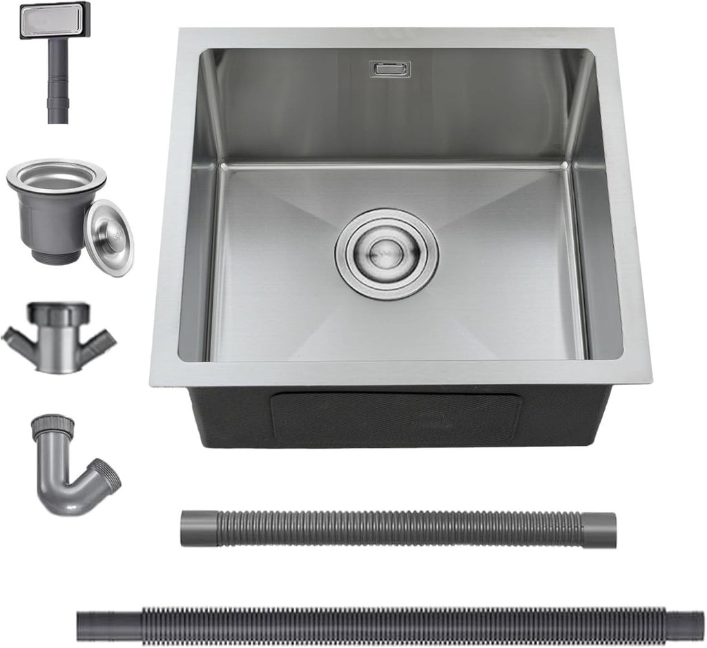 BoomHoze Stainless Steel Kitchen Sink Undermount Single Bowl Outdoor Campervan Sink with Silencer Pad, Drainer Fittings, Drop in Flush or Top Mount Installation, Brushed Finish 40x40cm