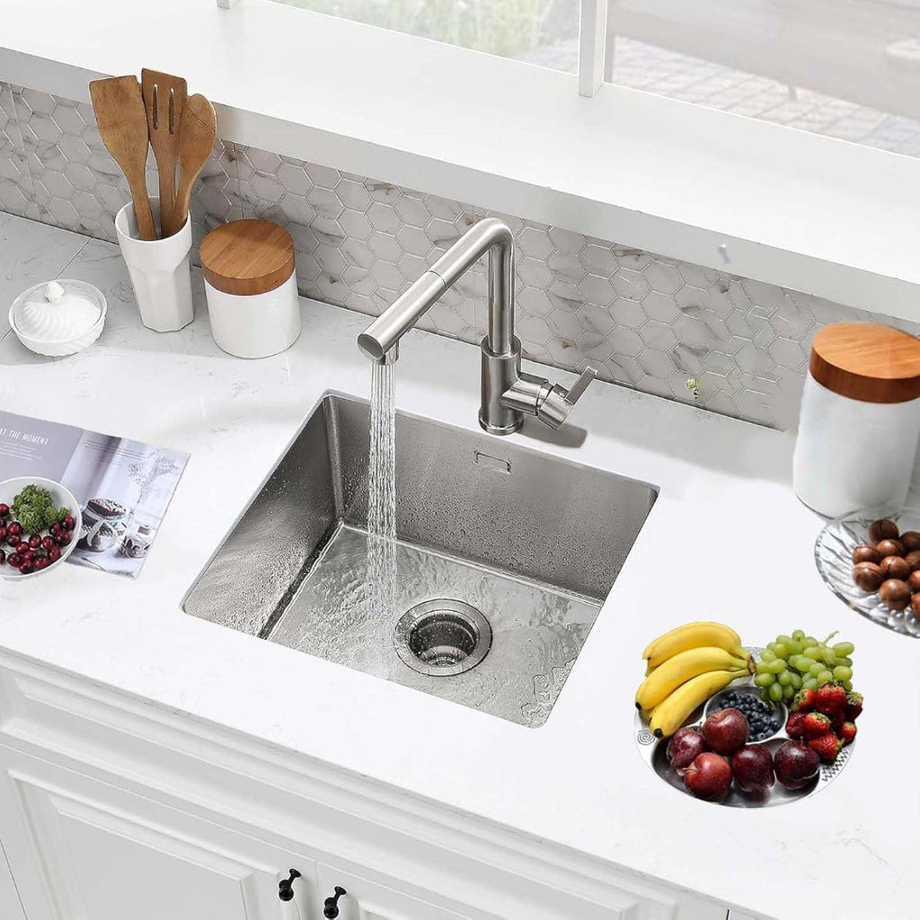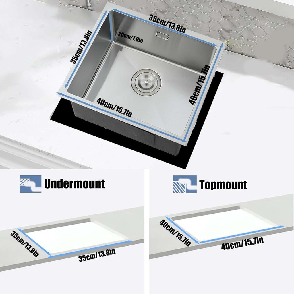 DIMENSION: Box comes with stainless steel kitchen sink 40 x 40 x 20 cm(16x16x8IN), standard strainer, drain, drain basket. The single bowl sink is widely used, generally can be installed in private spaces such as kitchens, balconies, utility rooms, etc., and can also be installed in large public areas such as bars, pubs and restaurants.