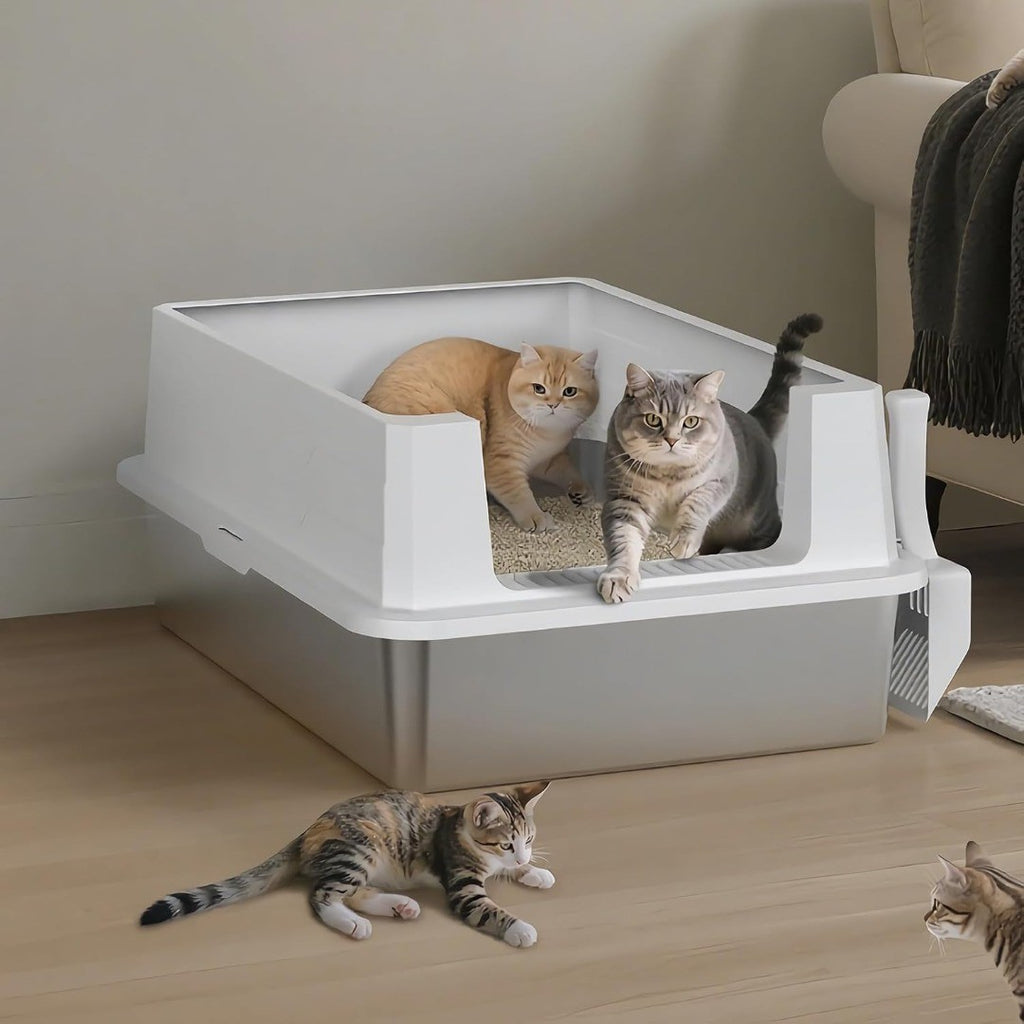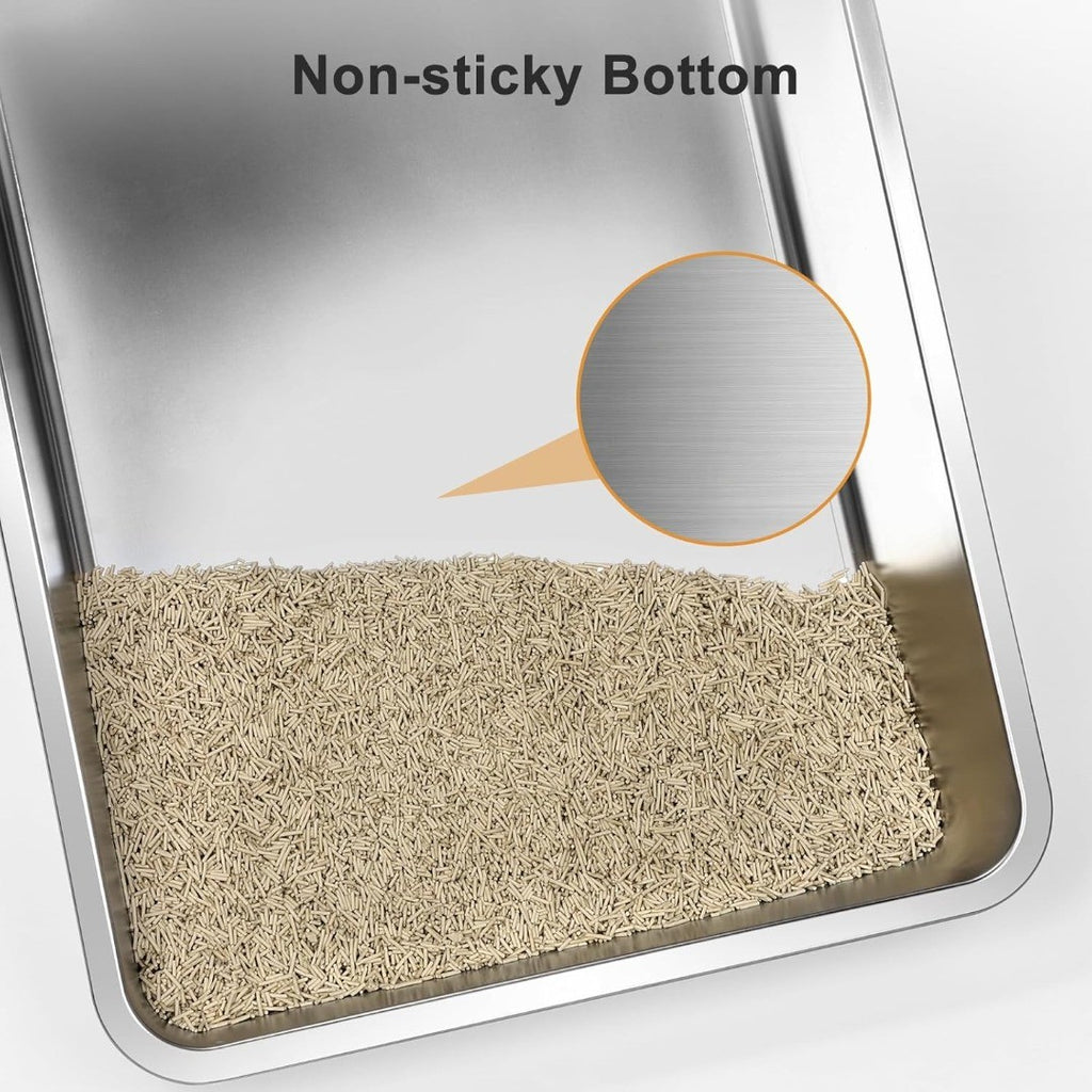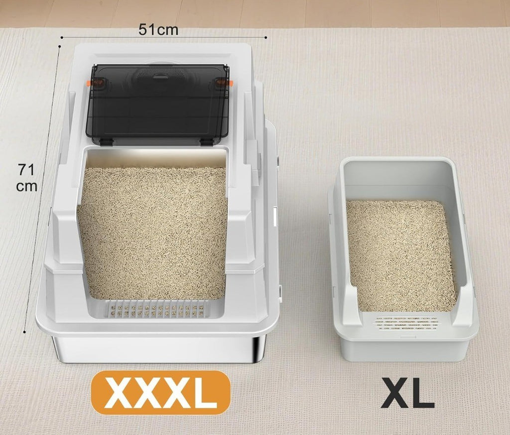 XXXL Large Size&Cat Specific Metal: we have developed stainless steel materials for cat litter tray. Compared to traditional plastic materials, it has the functions of no odor/long-term drying/permanent cleanliness/no cracks/not wear out. Cat litter will not stick to the bottom and avoiding skin diseases. the size(L71xW51xH31cm)ensure there is enough space to move, perfect for large cats and multi-cat households. You can go out for 20 days without needing to replenish cat litter.