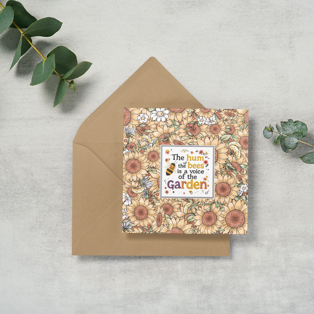The Hum of the Bees is the Voice of the Garden Greeting Card. This bee range describes the relationship between humans and bees, both of which are important to each other. This card is printed on 300gsm pulp board. Printed one side, so blank inside for your own message.