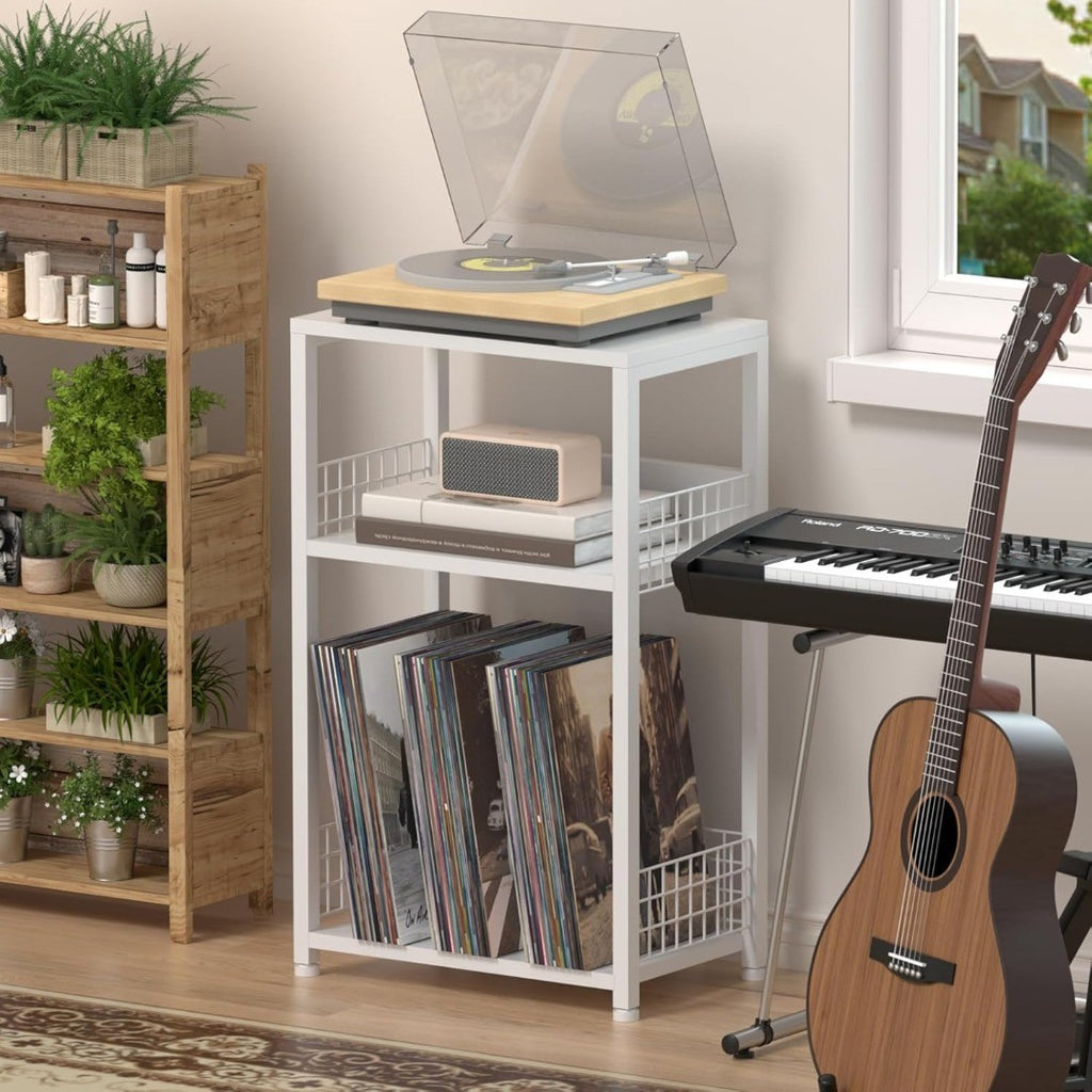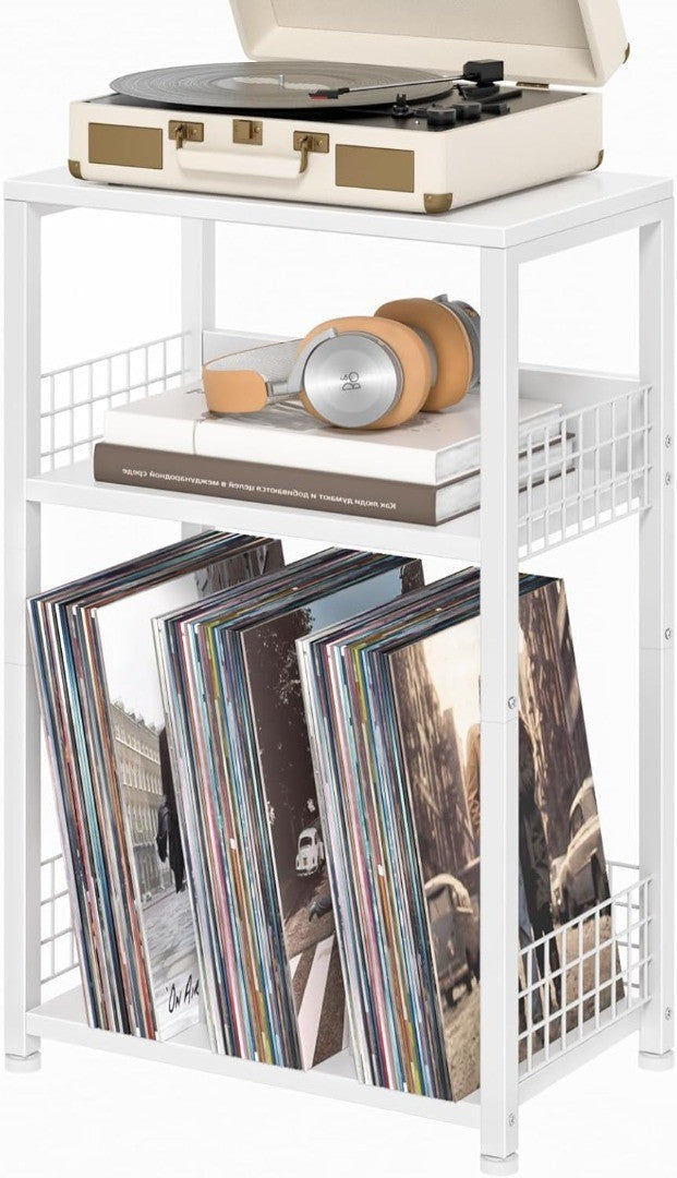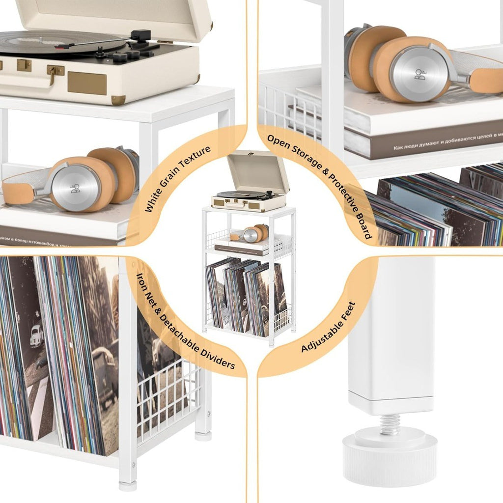 LELELINKY Record Player Stand with Vinyl Storage Up to 100 Albums,3 Tier Record Player Table with Protective Net, Distinctive End Table. Multi-Functional Turntable Stand for Living Room, Bedroom(White)
