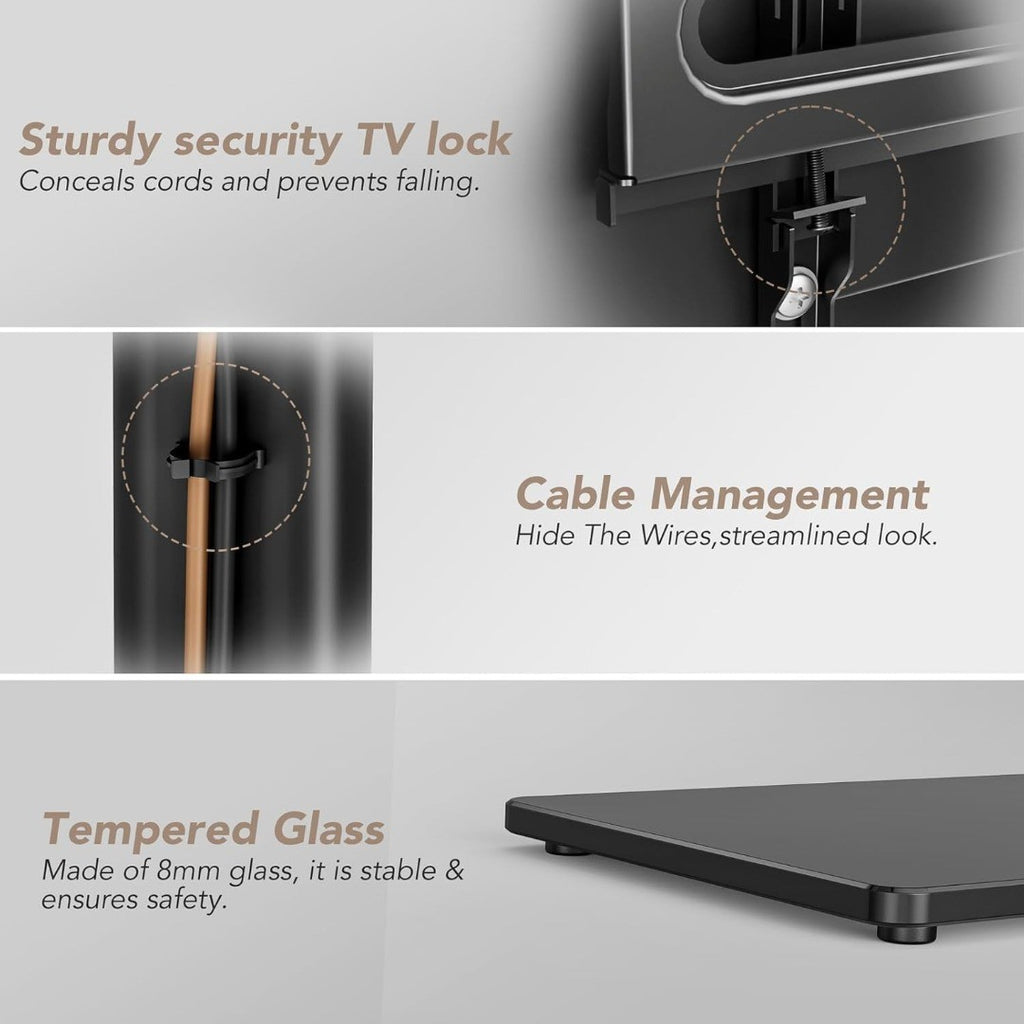 SMART DESIGN: This smart floor TV stand comes with 10mm solid tempered glass base that connects to a solid steel pillar which provides stable support for your TV that creates a modern look for your audio video equipment, it can hold up to 77lbs.