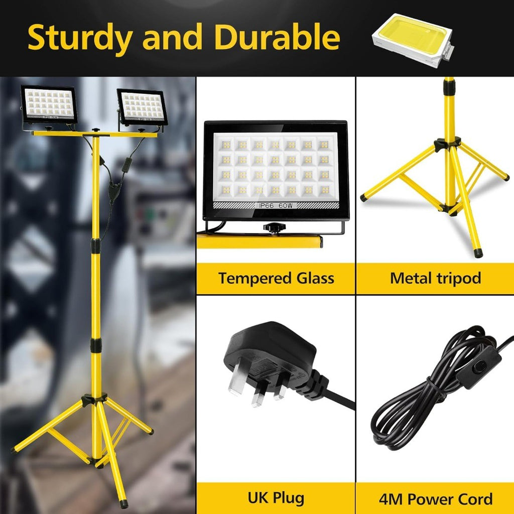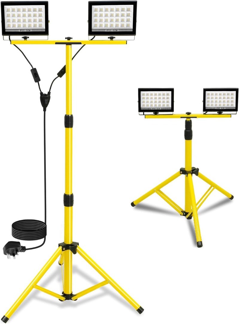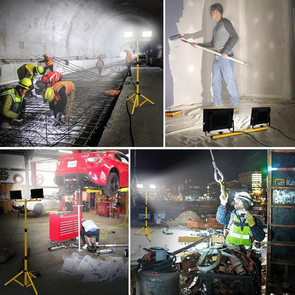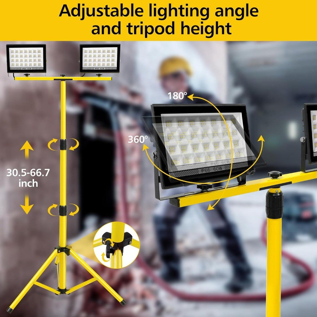 - The telescoping tripod work light folds effortlessly for easy transport and storage, and can be adjusted to various heights (24-61.3 inches) to suit your needs. Each lamp head is detachable and can be used independently, with its own switch for added convenience. The 13ft power cord provides extended reach, offering greater freedom of movement. Perfect for construction site lighting, outdoor garage work, camping, and emergency lighting.
