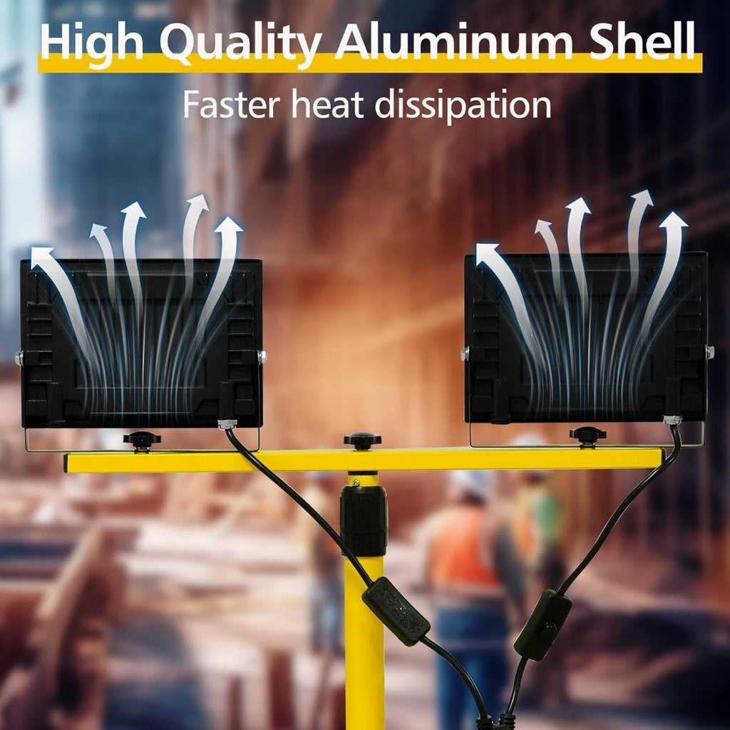 - Unlike other indoor and outdoor work lights on the market, our job site work light mains powered is designed with professional-grade materials for efficient cooling. Made of cast aluminum housing and tempered glass, this led work light with stand is durable and compact. IP66 waterproof technology is adopted for details from housing, and frames, to all the connecting parts, so can withstand use indoors or outdoors, and even to be exposed to rain or snow.