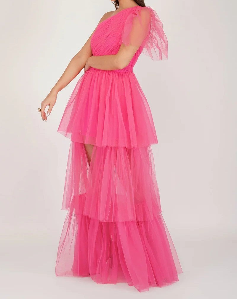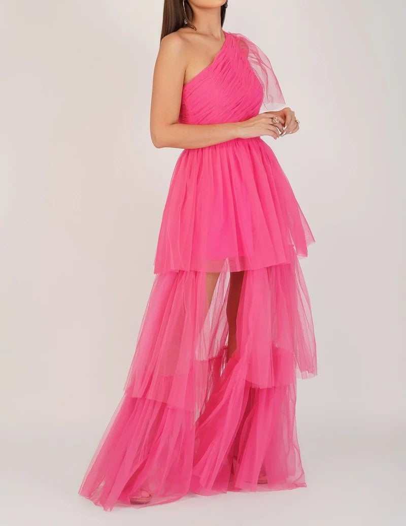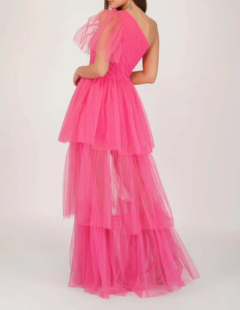 Lace & Beads Women's Plus Off Shoulder Tulle Gown in Hot Pink