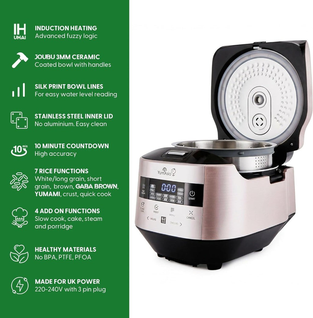 - UMAI INDUCTION HEATING (IH) RICE COOKER TECHNOLOGY - ‘Umai IH’ (or smart brain) is a highly advanced IH phased rice cooking system that ensures perfect results with tailored useful multifunction functions including steam, porridge, slow cook, cake baking and crust (tahdig) settings. 24 hour preset timer and keep warm features.